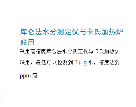 - 采用高精度庫侖法水分測定儀與卡氏加熱爐聯用,最低可以檢測到3μg水,精度達到ppm級